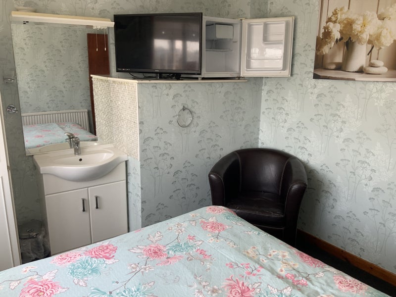 Large bedroom with new double bed. Tastefully decorated with tv wardrobes drawers and fridge. Rent includes cleaning of room and changing bedlinen once a week. Shared microwave