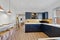 A breathtaking kitchen area with a modern range of wall and base units with laminate worktops and breakfast bar, an integrated double electric oven with two inset ceramic hotplates and extractor fans over, two inset composite sinks, integrated dishwasher, soft close cupboards and drawers with copper detailing, engineered oak flooring, a radiator and double glazed sash window to the side. Door leading into the utility room.