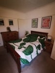 Double bed, chest of drawers, cupboard with lots of hanging space. Airing cupboard (silent) ideal for drying.