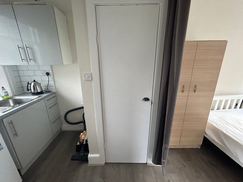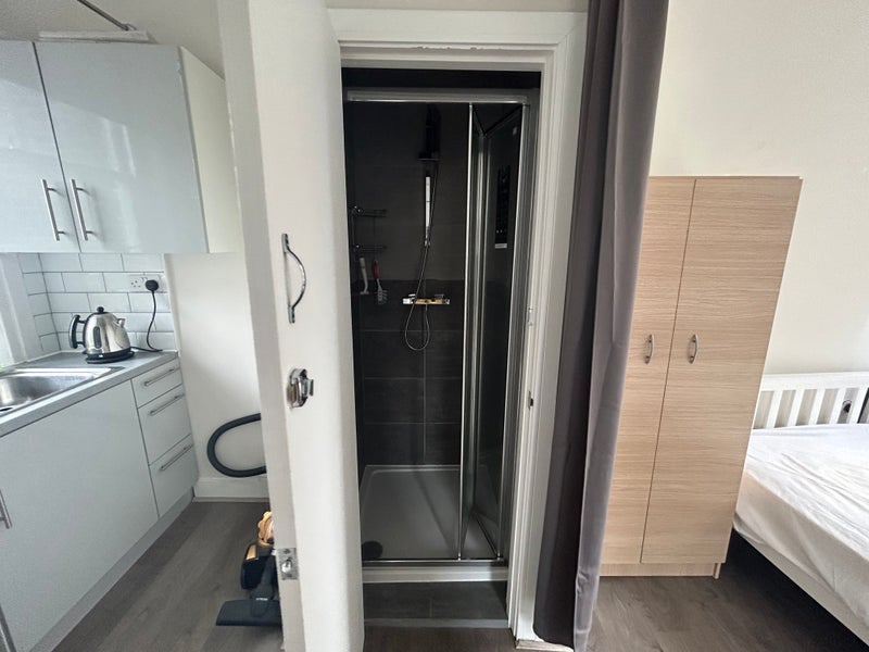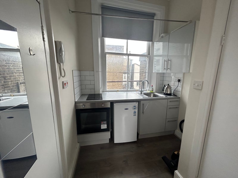 This studio is on the first floor and is vacant now. A new tenancy is required within 14 days. Own bathroom with WC, shower + vanity basin. Plus your own kitchen with full size cooker and hob. Please note there is no washing machine in the studio, but there is a laundrette nearby with new machines. Also the tube line runs very low down at the back of the property, so this can be heard to some extent when trains pass.
