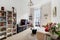 A cozy lounge with a comfy sofa and TV, a modern library collection, electronic music instruments, and a vinyl station.
