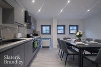 The apartment provides ample natural light with open plan living space with dining table and chairs. The kitchen benefits from a range of wall and base cupboard units and includes free standing fridge-freezer, electric oven and induction hob. One double bedroom and a modern bathroom is neutrally decorated with a modern suite.