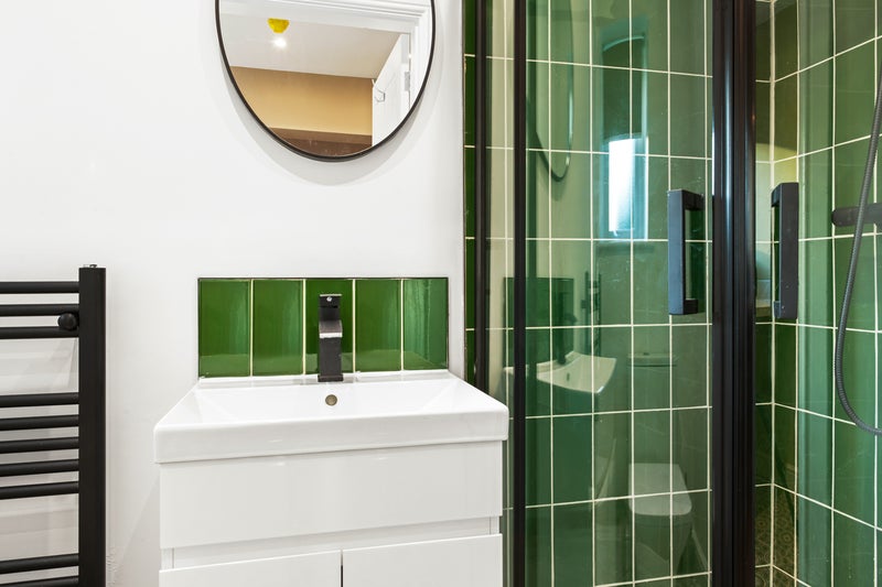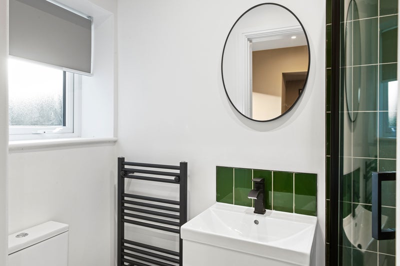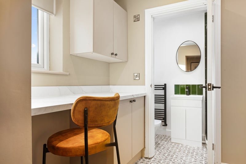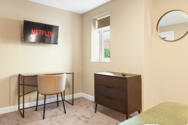 Ground floor living; walking into this room doesn't feel like just a room! This spacious living includes: Smart TV mounted on the wall, double bed with luxury bedding, chest of drawers, double wardrobe and cosy bedside cabinet. This room also includes ample worktop space and a beautifully crafted velvet chair. The en-suite is elegantly refurbished with walk-in cubicle shower, toilet & mosaic effect flooring.