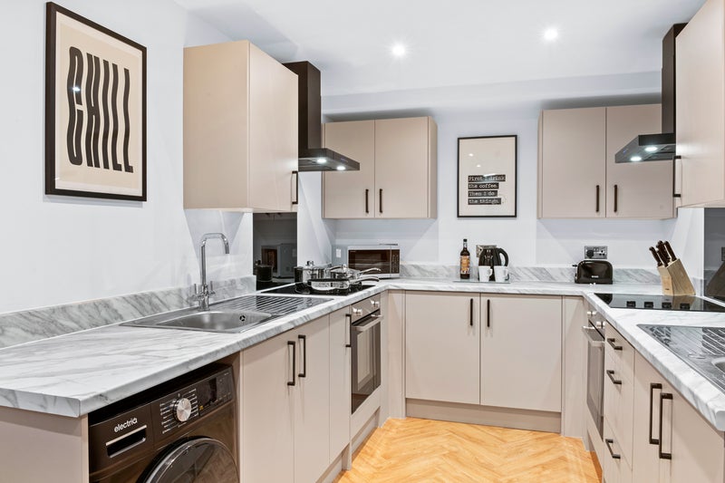 The communal kitchen is brand new, with modern, marble effect work tops, high spec appliances including : washer/dryer, two ovens with modern extractor fans above, free standing fridge freezer, microwave, kettle & toaster.