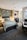 bed side tables with pendant lights above