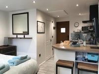 An open plan kitchen/ Bedroom are on the ground floor next to a fully tiled wet room. There is a modern kitchen with breakfast bar, an electric oven, hob, fridge freezer, microwave, toaster, kettle. The kitchen is equipped with essential kitchen equipment needed for your self-catering stay. We provide tea, freshly ground coffee with cafetiere, sugar and milk. There is salt, pepper and spray oil in the kitchen. Hand soap, washing up liquid, kitchen towel, antibacterial anti-viral spray, tea towel and hand towel are also provided.