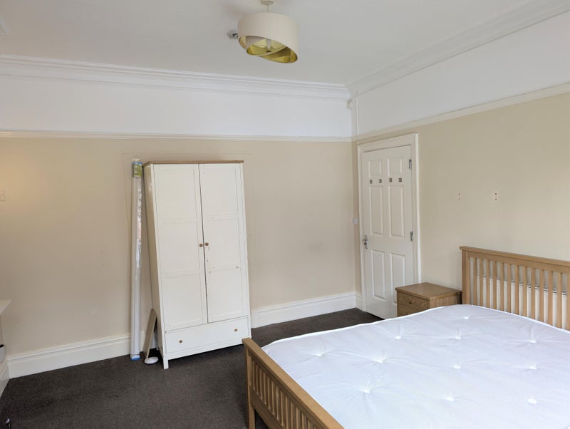 - King size bed with mattress, 5 drawer chest cabinet, wardrobe and bedside table included.