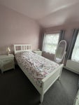 This bright and cozy bedroom offers a welcoming and peaceful space, perfect for someone looking for comfort and convenience. The room features a double bed, bedside tables, a full-length mirror, and a spacious wardrobe for storage. With two large windows that let in plenty of natural light, the soft pink walls and matching white furniture create a warm and homely atmosphere. The property is well maintained and located in a quiet residential area, with easy access to public transport, shops, and local amenities — ideal for a professional or student seeking a calm and tidy home.