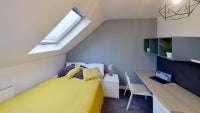 Room available to rent in a clean, modern shared property close to the University of Nottingham. The room includes a bed, desk, storage, and a skylight. The house has a modern kitchen, dining area, and secure bike parking in the backyard.