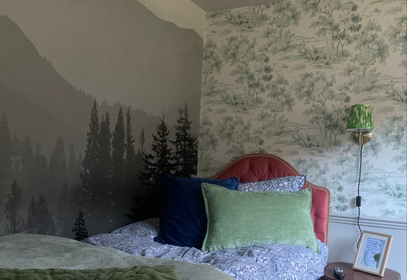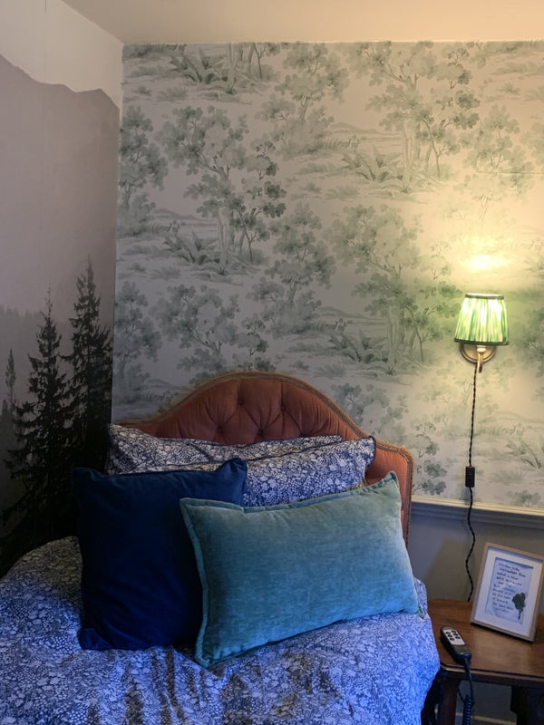 The room has a very comfortable electronic adjustable single bed, 100% cotton bedding and mattress protector, fitted wardrobe, desk, bedside table, wall-hung lamp and a lovely wingback chair with footstool. Tongue & groove panelling, soft green tones and a large tree mural reflect the beautiful view. Wall to wall windows look out across open fields with sheep, drystone walls and a distant forest – perfect for relaxing and taking in the scenery.