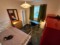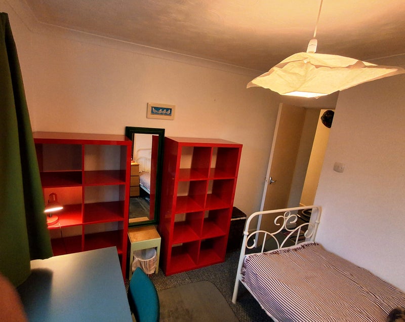 Bright and generously sized, furnished (single bed, desk and chair, chest of drawers, wardrobe and 2 cube-like shelving units - plenty of storage!)