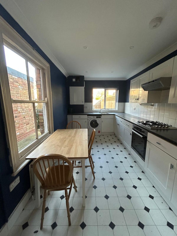 The house is fully furnished, with the bedrooms having a double bed, desk and chair, and storage space. There is a cosy living room and a large kitchen, which backs onto a patio and garden. The house also has a spare room which functions as a study, guest room, and yoga room.