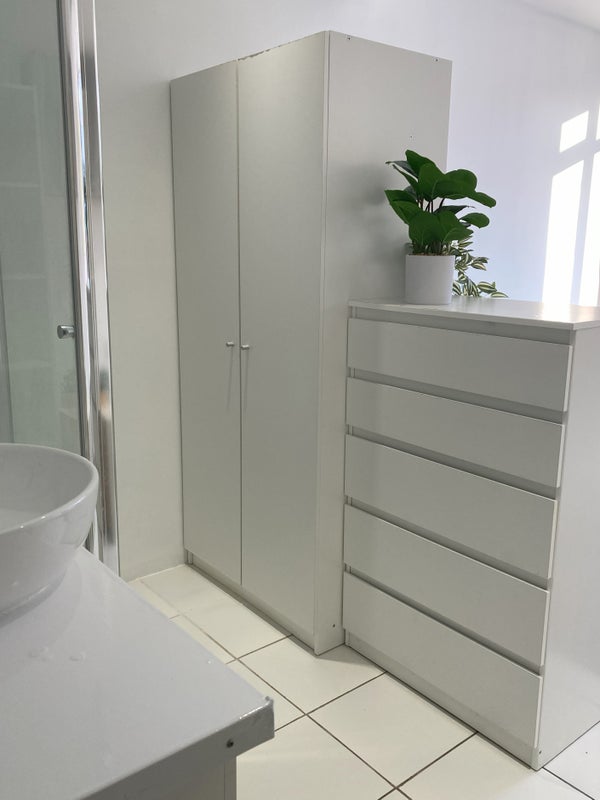*Wardrobe, large chest of drawers, shelves, desk and chair