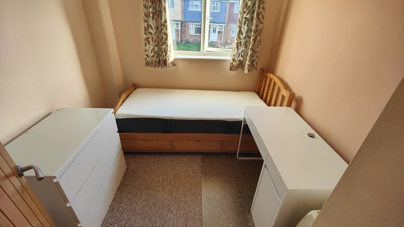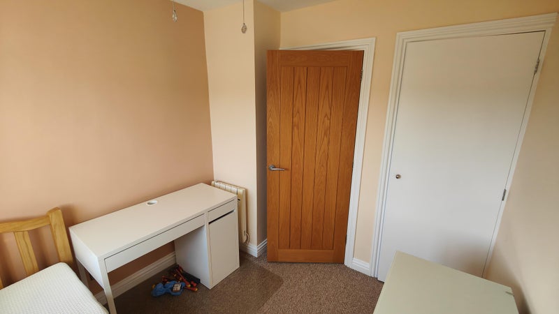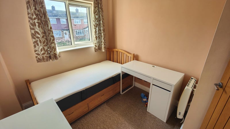 Single bedroom has pine wooden framed double bed with Emma mattress purchased 2 years ago, programmable electric heater, ceiling fan, built-in wardrobe with clothes rail and shelf, desk & chair, set of 4-large drawers, bedside set of 2-small drawers. Viewing highly recommended.