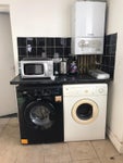 Cooker, Washing machine and Dryer with access to fridge and cupboards.