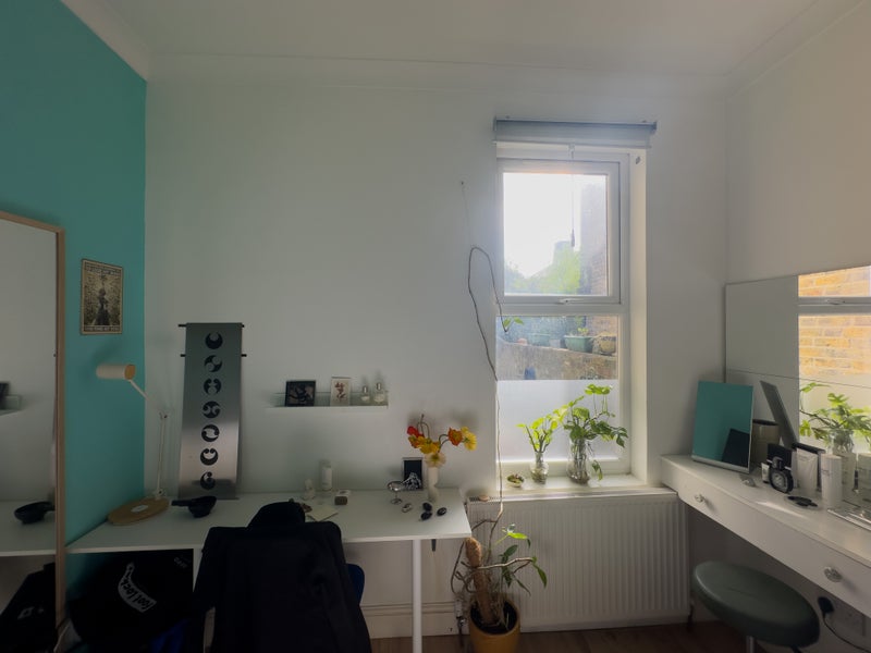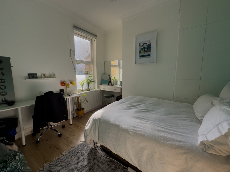 The room is a small double on the ground floor which is at back of the house, over-looking our garden so it's very quiet (other than the local London foxes!). The room is furnished (double UK bed with mattress, a built-in dressing table with a few draws and large mirror, some built in cupboards, a bedside table/cupboard, a long shelf-style desk, plus a large 43inch TV on the wall, plus a few shelves, a long mirror, and a ottoman.