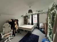 - Room comes furnished with double bed, wardrobe, chest of drawers, bookshelf and end table. We can also request a desk and chair from the landlord.