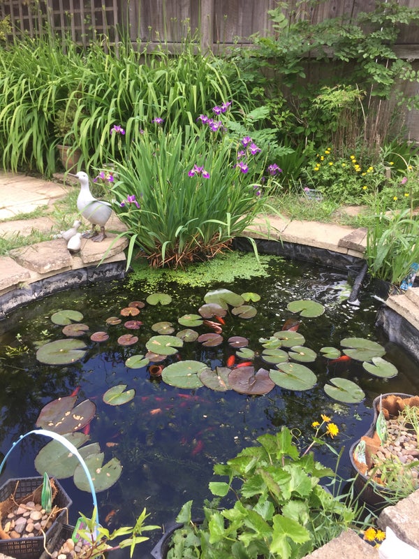 Garden with ponds bedroom with beds small table and chairs plus tv, wardrobe, etc.