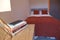 foam mattress, white high gloss chest of drawers, bedside table and wardrobe.