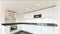 Accommodation comprising an open-plan living room with a modern kitchen with integrated appliances.