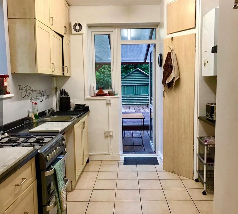 The good-sized kitchen is fully furnished, and the bathroom is located upstairs with a separate toilet (to share with 2 others).