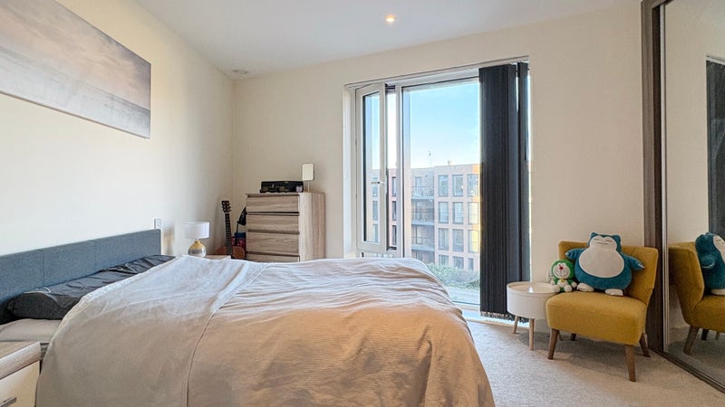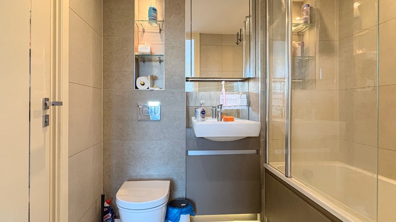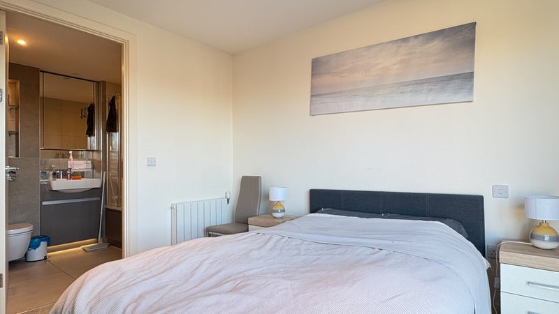 The spacious double bedroom offers built-in storage and a calm, comfortable environment, while the modern bathroom is finished to a high standard with contemporary fixtures and fittings. Additional storage space within the apartment adds to the practicality of the home.