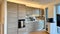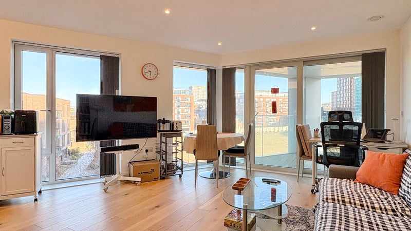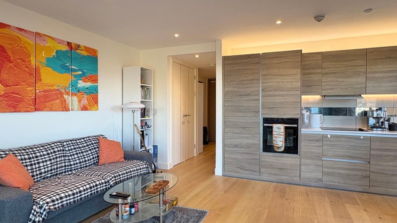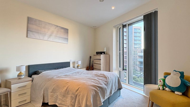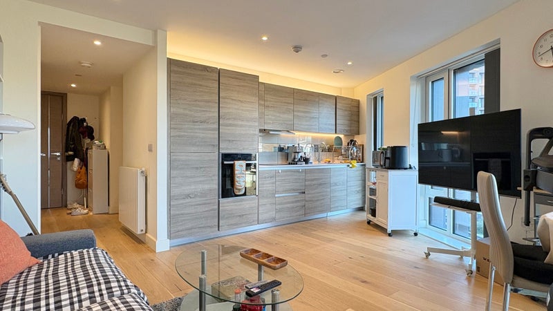 The apartment features a bright open-plan living and dining area with large windows that allow plenty of natural light to fill the space. The contemporary fitted kitchen comes complete with integrated appliances, sleek cabinetry, and ample worktop space, making it ideal for both everyday living and entertaining. The living area also provides access to a private balcony, perfect for relaxing or enjoying views of the surrounding development.