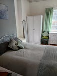 The first of 4 x Double rooms, in a clean, warm, friendly house, The room is a good size double due to being on the ground floor, freshly painted, you can easily change bedding colour to your choosing if needed. We supply either grey first photo or pink bedding, last photo. Bathroom also on the ground floor. Shared kitchen, starter items supplied. Lovely shared living room. It is £560 for a single person. Depisit £560.