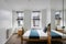 This flat has five bedrooms, all kitted out with matching light oak furniture. Double wardrobe, chest of drawers, double bed, bedside chests, desk and executive style chair.