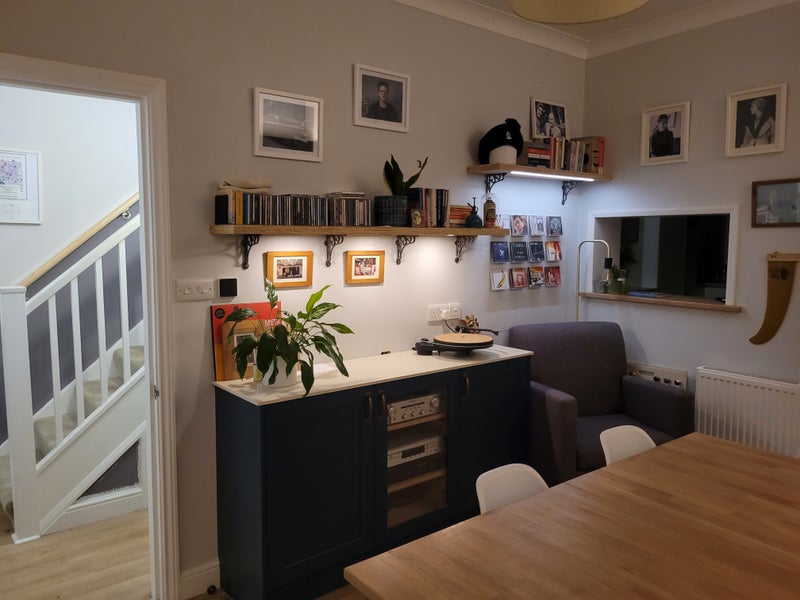 DINING ROOM: It has table that seats 6 (8 when extended) comfortably with an armchair in one corner. It’s a great room for entertaining, relaxing or listening to music. It has a really good adjustable lighting system that can be used to create the perfect mood for any situation. There is a 43-inch smart TV & hi-fi system inc. record deck, CD player, FM radio. It’s all about listening at low volumes suitable for a shared space. The table can be used as a workspace for a laptop away from your room if you need a change of scenery from time to time.