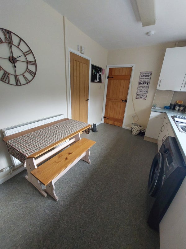 Shared kitchen with fridge and freezer, cupboard space and washing machine.