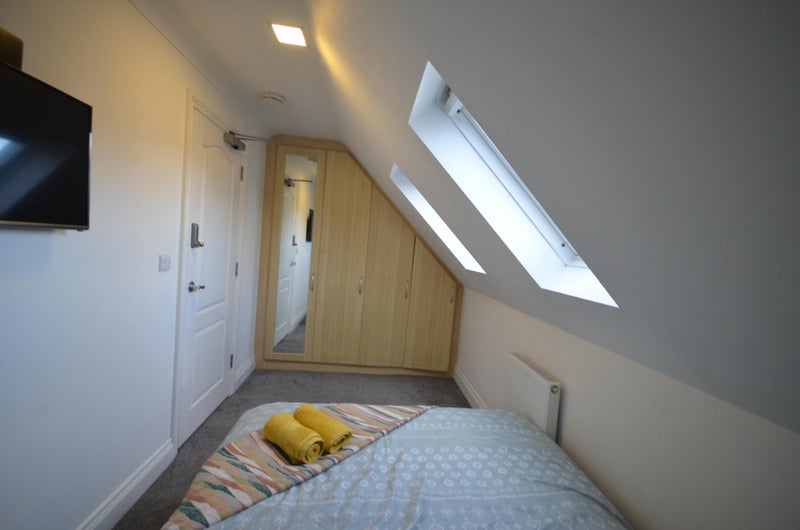 A bright and comfortable room is available in a well-maintained home with a positive, peaceful atmosphere. The room is fully furnished with a double bed and includes a TV, storage, and plenty of natural light.