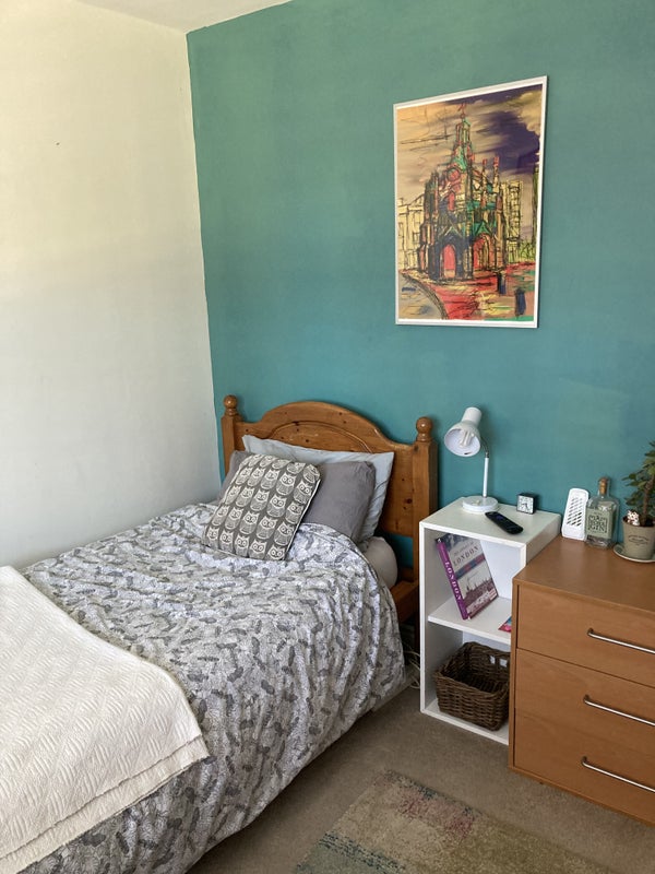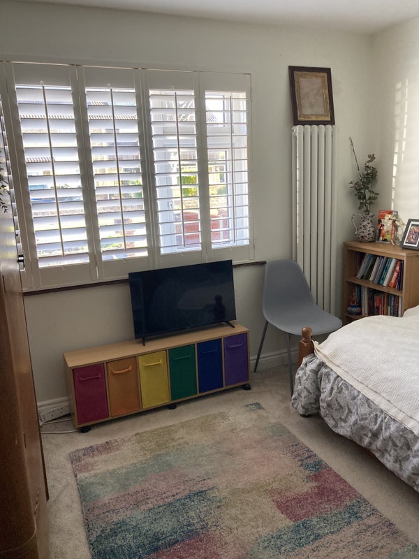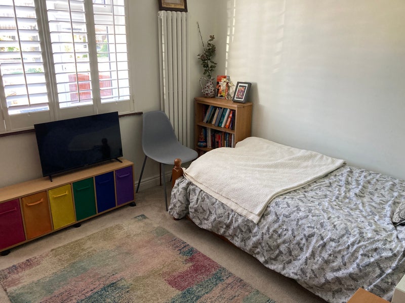Comfy double room with a single bed available in a family home. (Parent with 2 kids, aged 14 and 10 and a cat.) There is a bathroom downstairs, opposite the bedroom. The children use the bathroom upstairs. We have a large living room with a big open plan kitchen and a big back garden and patio, which you can use. There is also a washing machine.