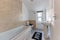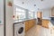 🏡 The house has a clean and modern communal kitchen/living area.