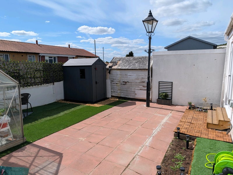 Parking is a big plus here — there’s a private driveway with space for 2–3 cars. The garden is fairly low maintenance with seating area, and a greenhouse if you have a greenthumb.
