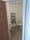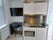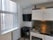 Kitchenette area: Wall and base units with Fridge, sink and standalone cooker.