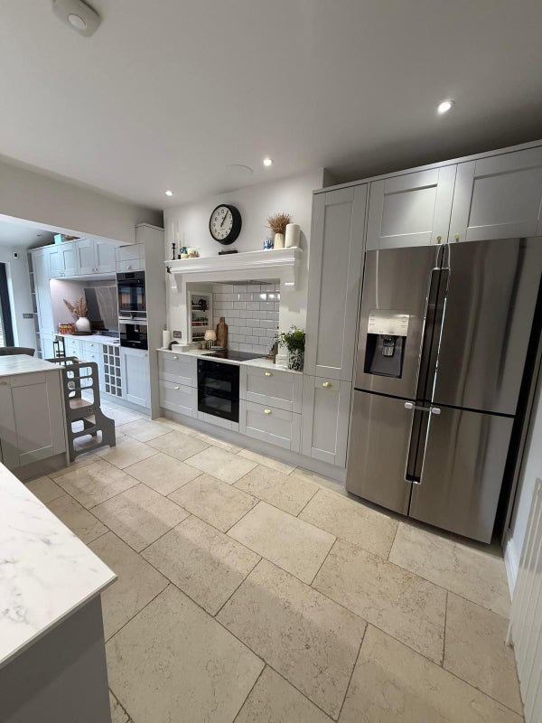 Open-plan kitchen and dining area with dishwasher, American fridge/freezer, built-in coffee machine, wine fridge and TV.