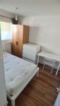 The flat itself has 2 bathrooms each with a toilet and are both communal. Big fully equipped kitchen with 2 fridge freezers so plenty of space for all your shopping, and also has a washing machine and a dryer. The room comes with a double bed, wardrobe, drawers a desk and chair and a big mirror