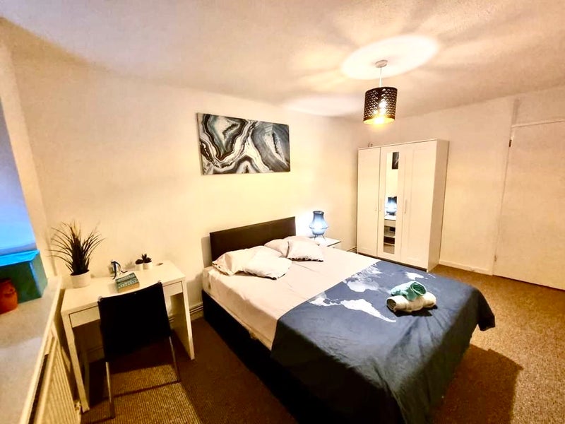 **Second big double room with double bed , 2 bed-side table, new wardrobe 3 doors + mirror, desk with chair and amazing view of East London night and day.