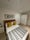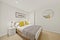 Furniture: Built-in large wardrobe, nightstand with bedside lamp, and a white tall chest of drawers for personal storage.