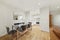 Fully equipped kitchen: High-gloss white cabinetry, integrated oven, dishwasher, electric hob, extractor hood, microwave, etc.