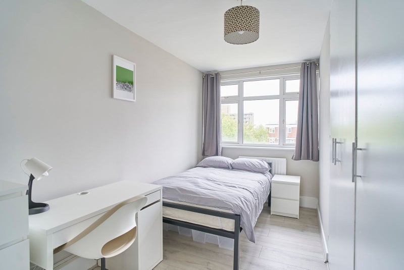 Step into a spacious, light-filled XL bedroom in a stylish four-bedroom flat-share at Fellows Court, perfectly situated in one of E2’s most sought-after areas. Your room comes fully furnished with a double bed, large wardrobe, chest of drawers, bedside table, and a desk with chair – ideal for work or study. The large window floods the space with natural light, creating a bright and airy atmosphere.