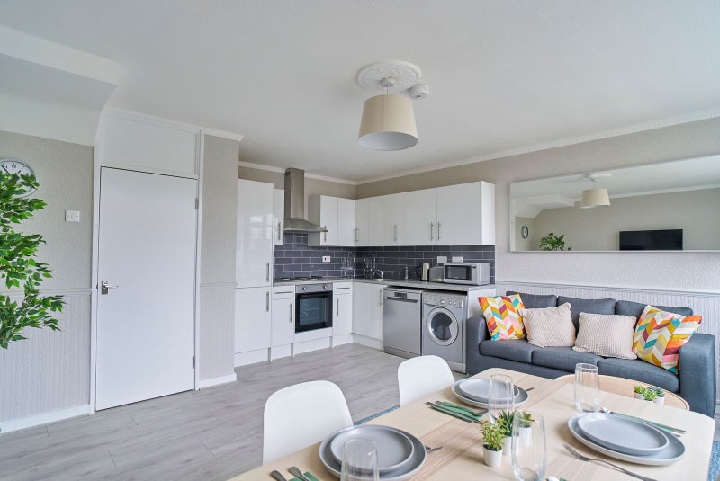 The split-level flat offers practical, comfortable living, with a separate bathroom and an additional toilet for convenience. Shared spaces include a modern kitchen with fridge/freezer, oven & hob, microwave, and a washer-dryer. Communal areas are kept fresh with fortnightly courtesy cleaning visits.