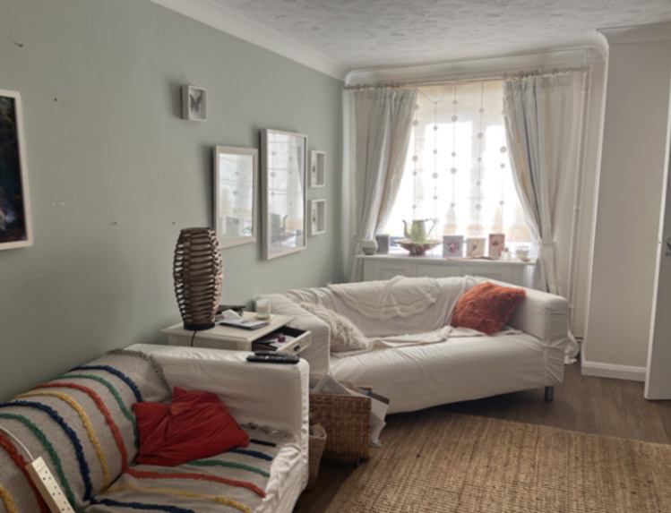 Lounge and separate kitchen . Driveway and small garden.