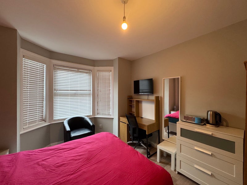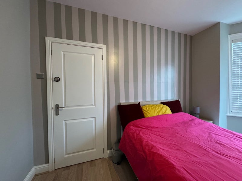 Beautiful comfy super large double room with everything you need to live! Comes with laminated floors, 32 inch smart TV, super fast broadband, brand new double bed, mattress, oak wardrobe, desk, chair chest of drawers. In the living room you have comfortable dining and sitting space with communal smart TV. Fully fitted new kitchen with washer dryer, american fridge freezer, dishwasher and all facilities. Access to downstairs toilet/shower and also access to upstairs bathroom. Includes all bills and council tax.