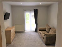 Clean, modern and spacious room has two sections; one sleeping area and one large living/study area with patio door to a large rear garden. The room includes double bed and mattress, bedside table, chest of drawers, fitted wardrobes and a 32 inch wall mounted SMART TV.