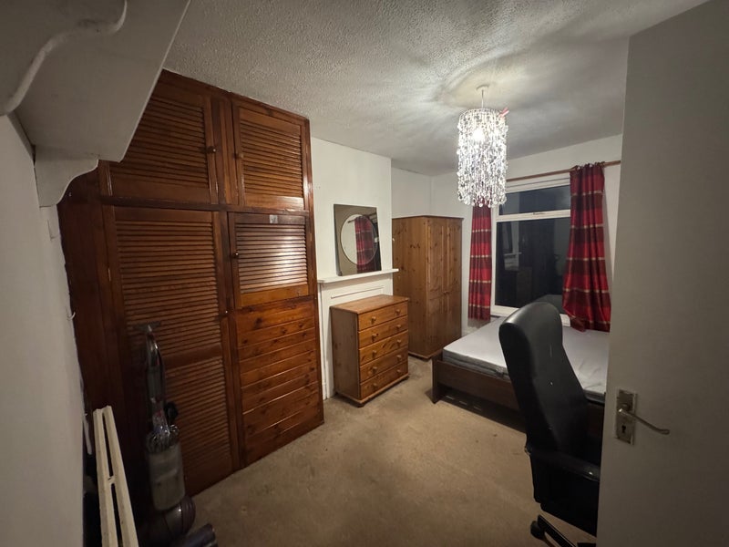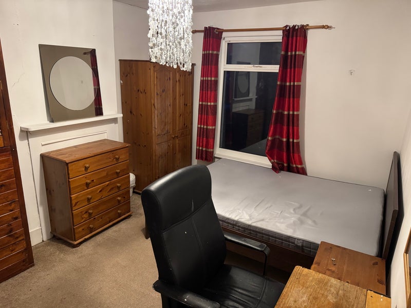 The room is located on the ground floor where the kitchen, a big bathroom and the rear garden are. The rest of the rooms are on the first floor and underground floor. The room is very spacious with double bed, desk, two wardrobes and fireplace with shelf above it and usable space for storage. Additional funniture like drawers is available for the room.