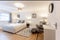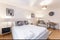 The generously sized double bedroom is tastefully decorated in neutral tones, featuring a comfortable bed, elegant furnishings, and a dedicated workspace, making it equally suited for home working. Large windows allow for plenty of natural light, enhancing the calm and airy feel throughout.