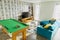 • Modern living room with L-shaped sofa, smart TV, snooker table, and AC/heating unit