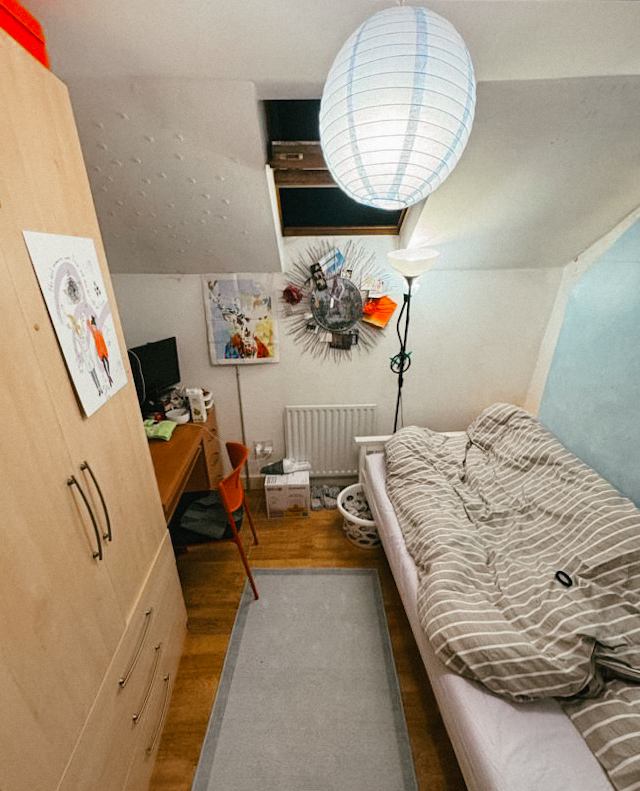 Quiet, cosy single room available on the top floor of a 4 floor house. The room comes furnished, with shelves, a large wardrobe, bed and a desk with drawers.